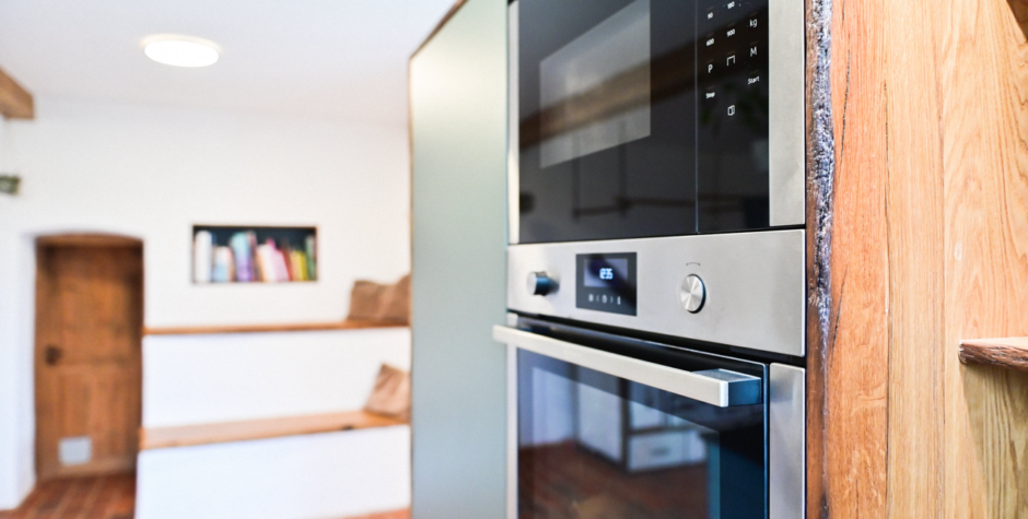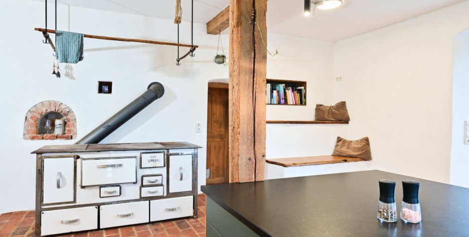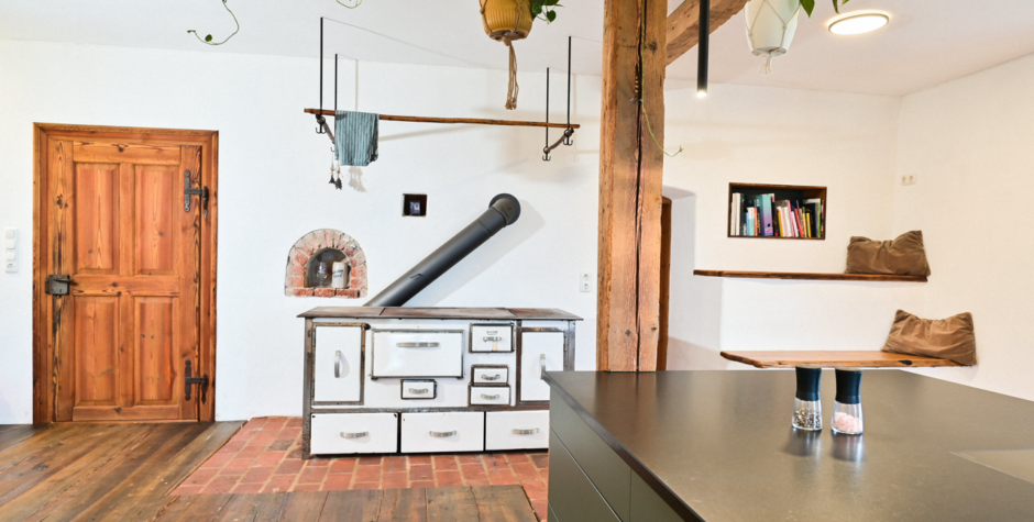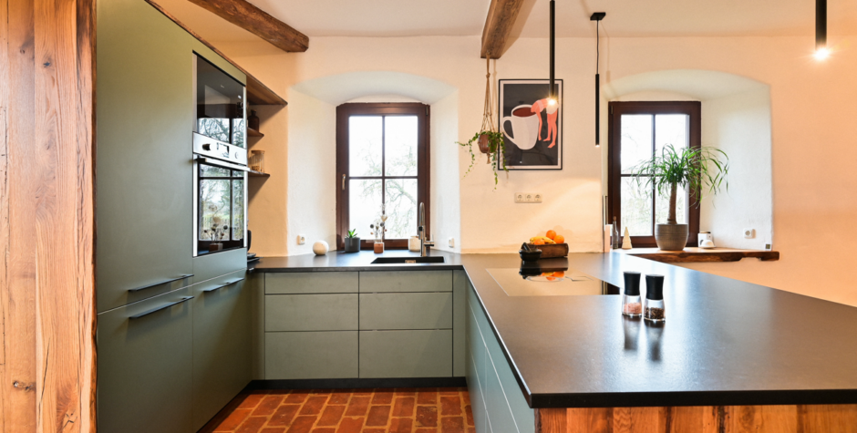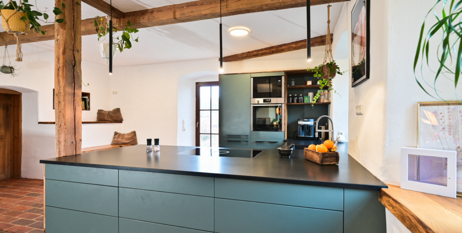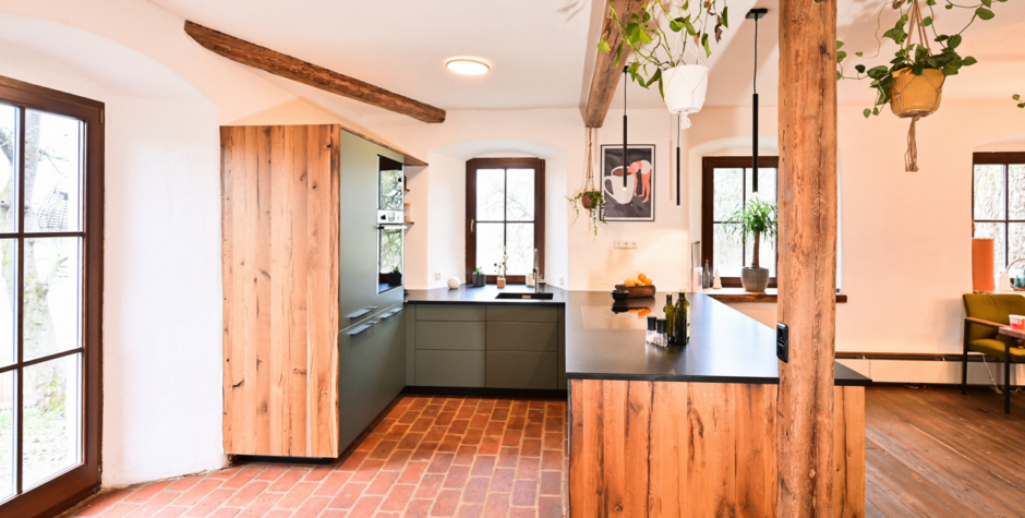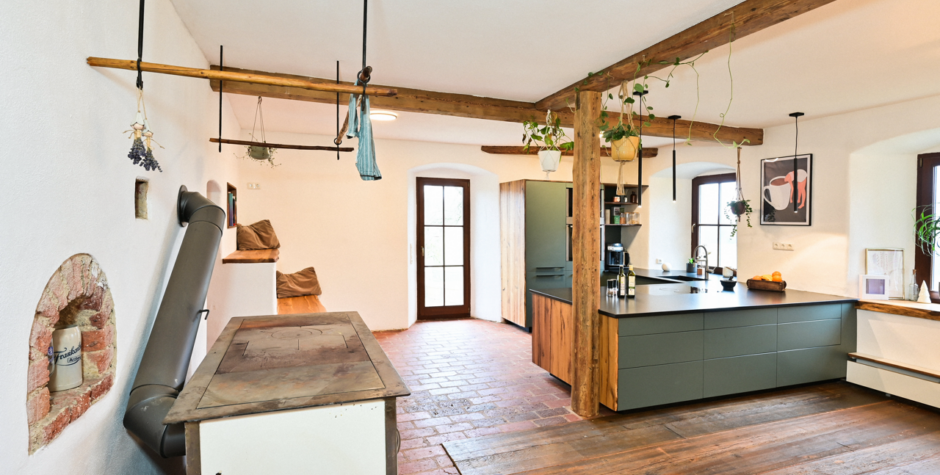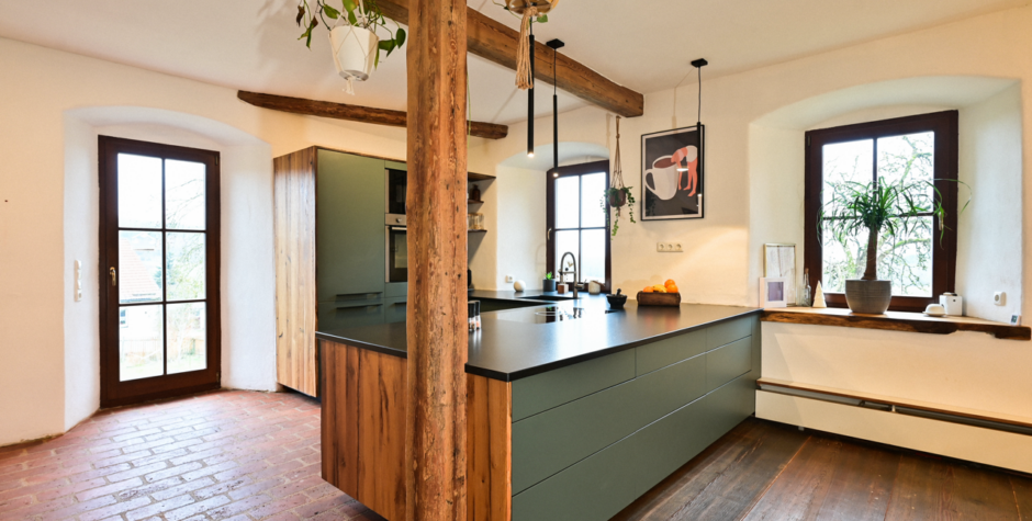 In einem alten Bauernhaus von 1842, dessen Balken mehr Geschichten tragen als mancher Bildband, ist eine Küche entstanden, die nicht laut sein will – sondern wahr.