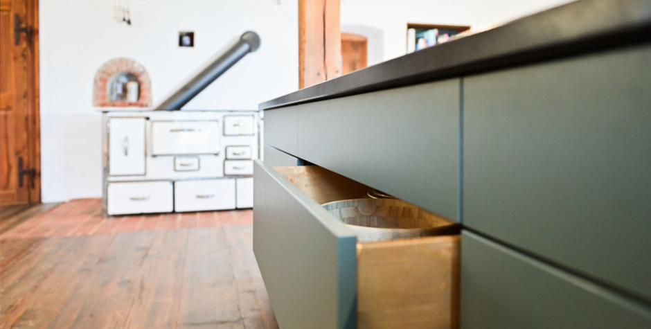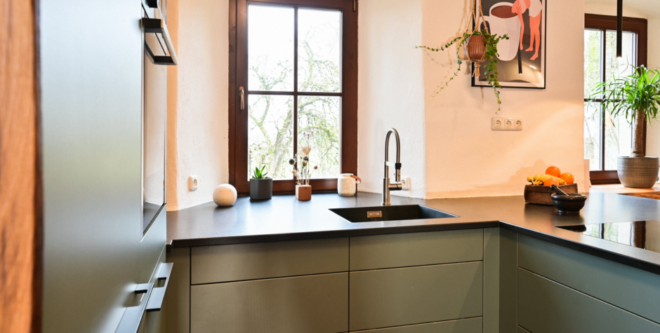 Die Fronten in Dunkelgrün – ein satter, erdverbundener Ton. Wie das Moos am alten Bruchstein, wie die schweren Fensterläden vergangener Jahrzehnte. Kein dekorativer Akzent, sondern eine Farbe mit Herkunft. Sie verbindet innen und außen, Raum und Landschaft, Gestern und Heute.