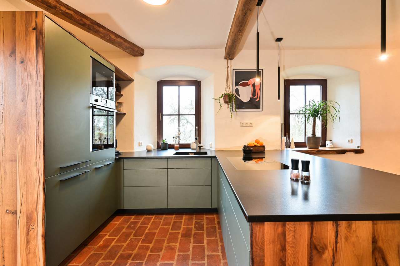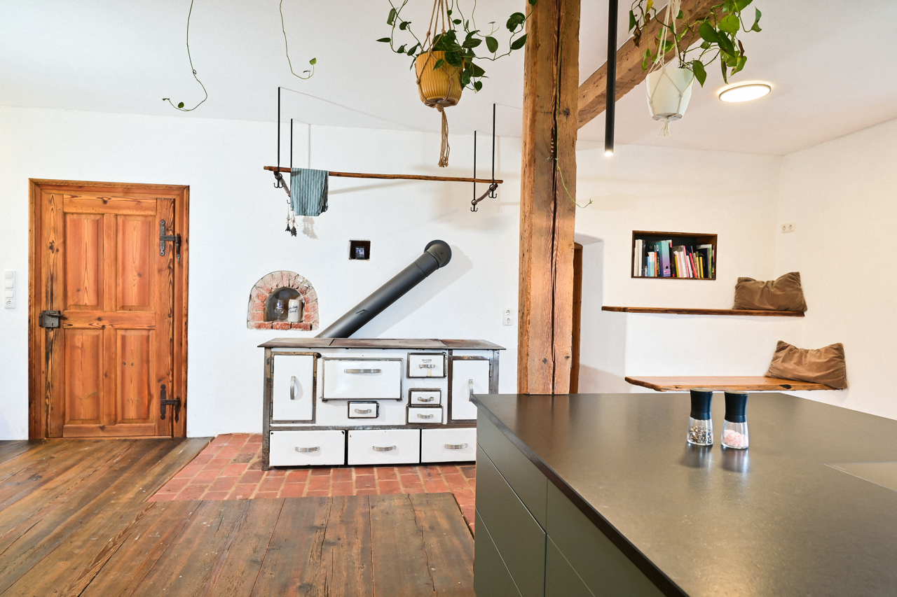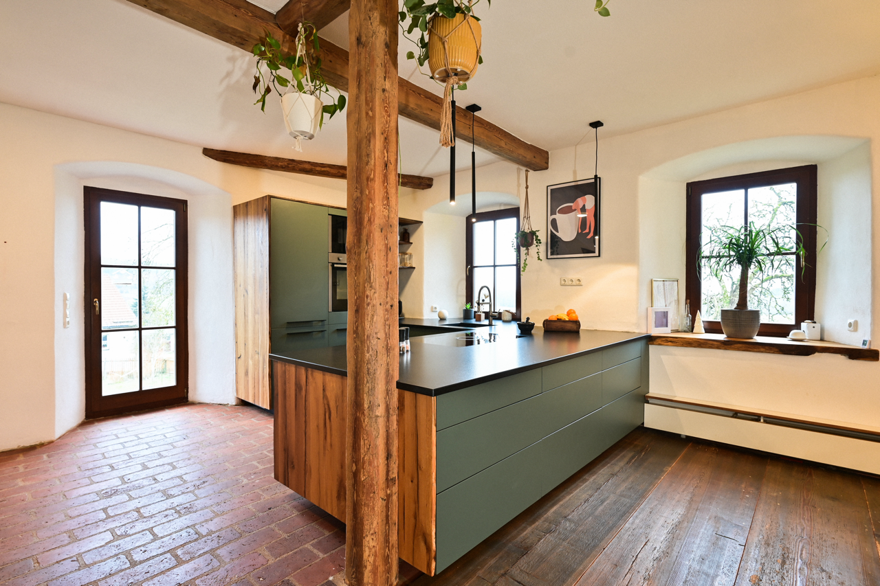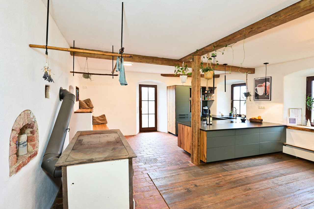 In einem alten Bauernhaus von 1842, dessen Balken mehr Geschichten tragen als mancher Bildband, ist eine Küche entstanden, die nicht laut sein will – sondern wahr.