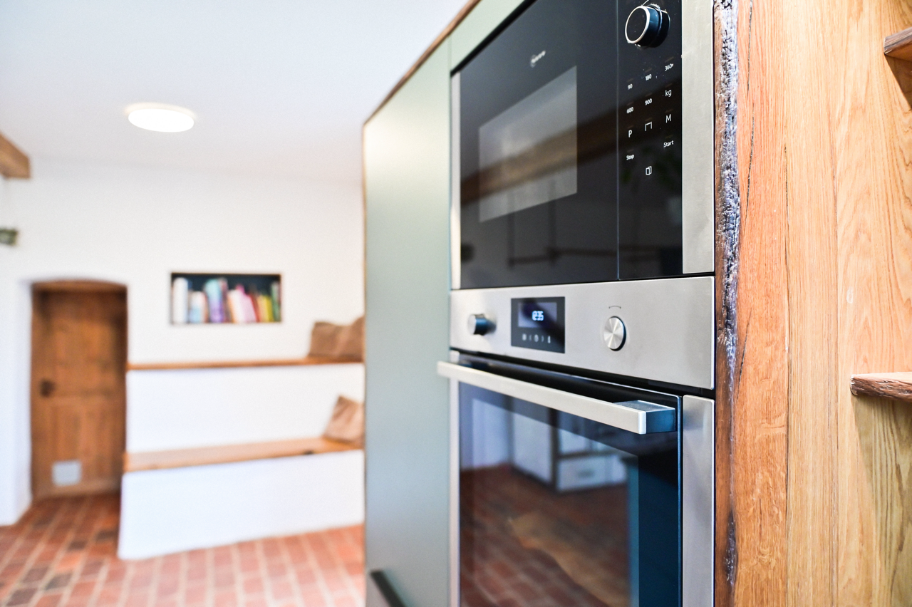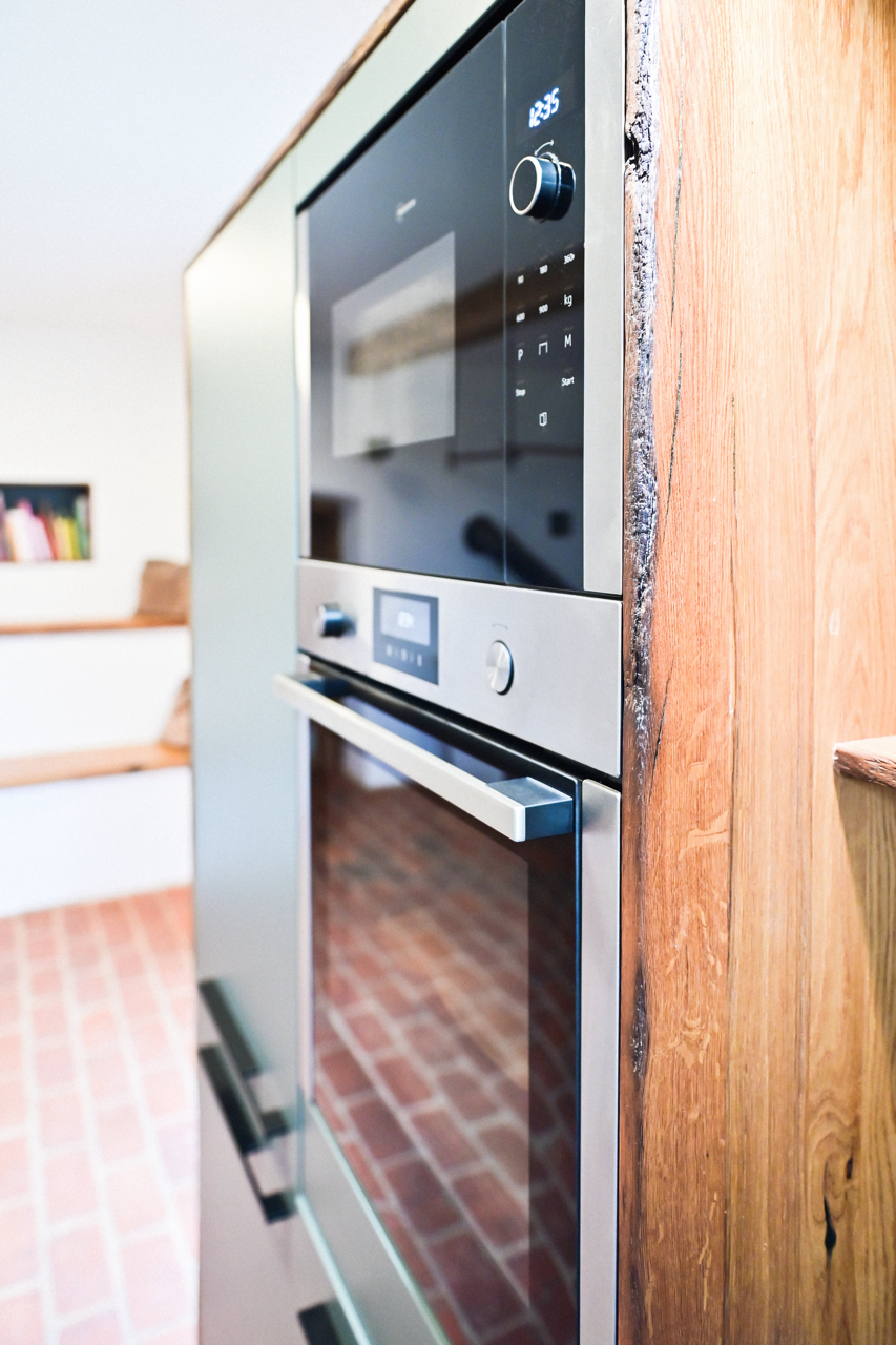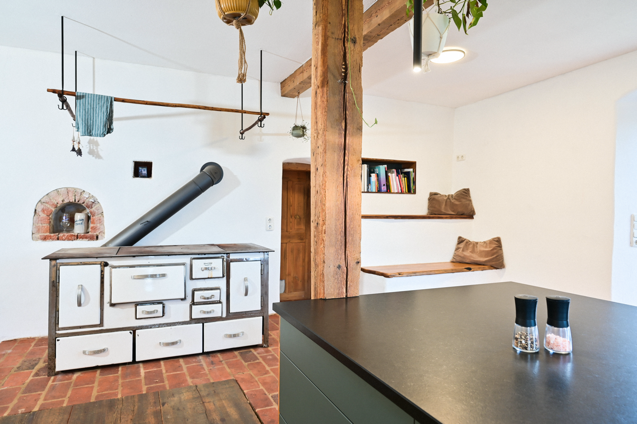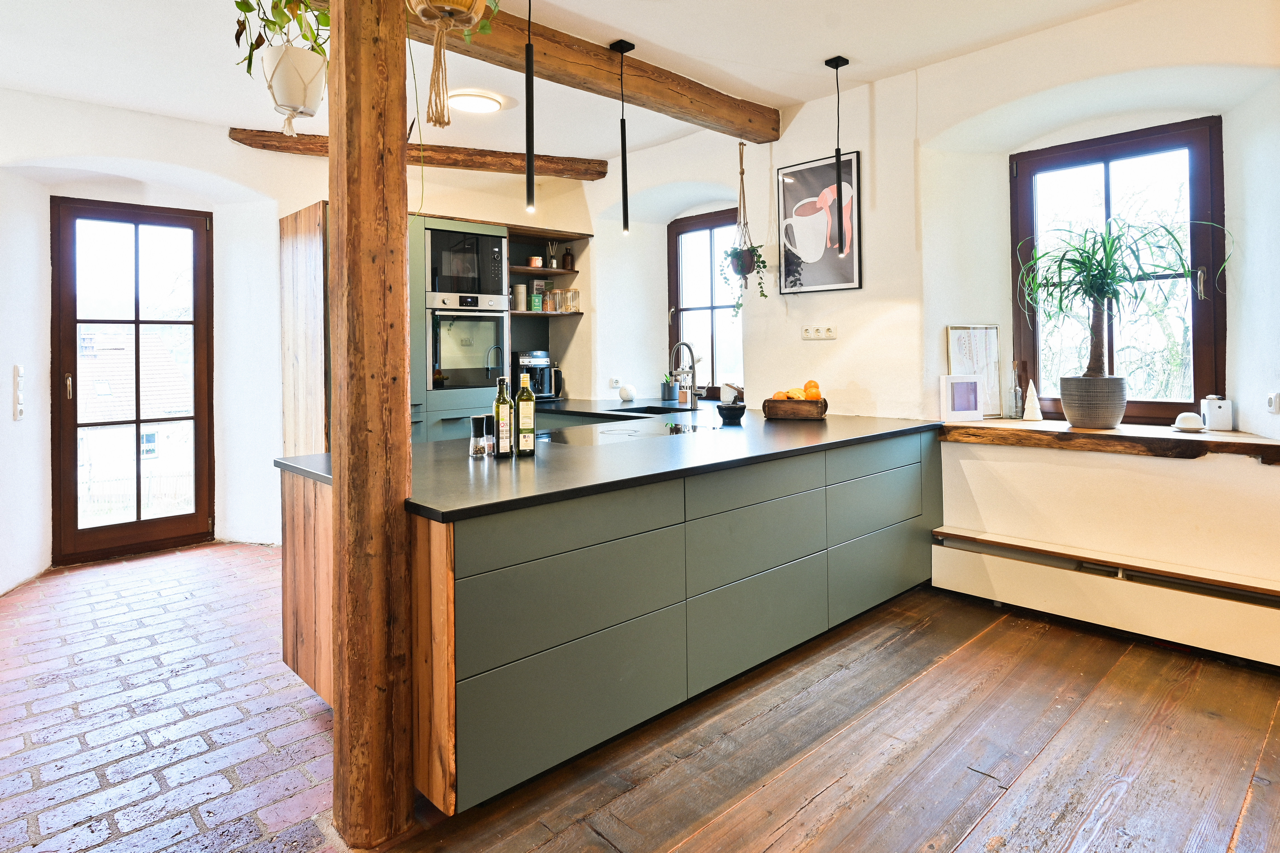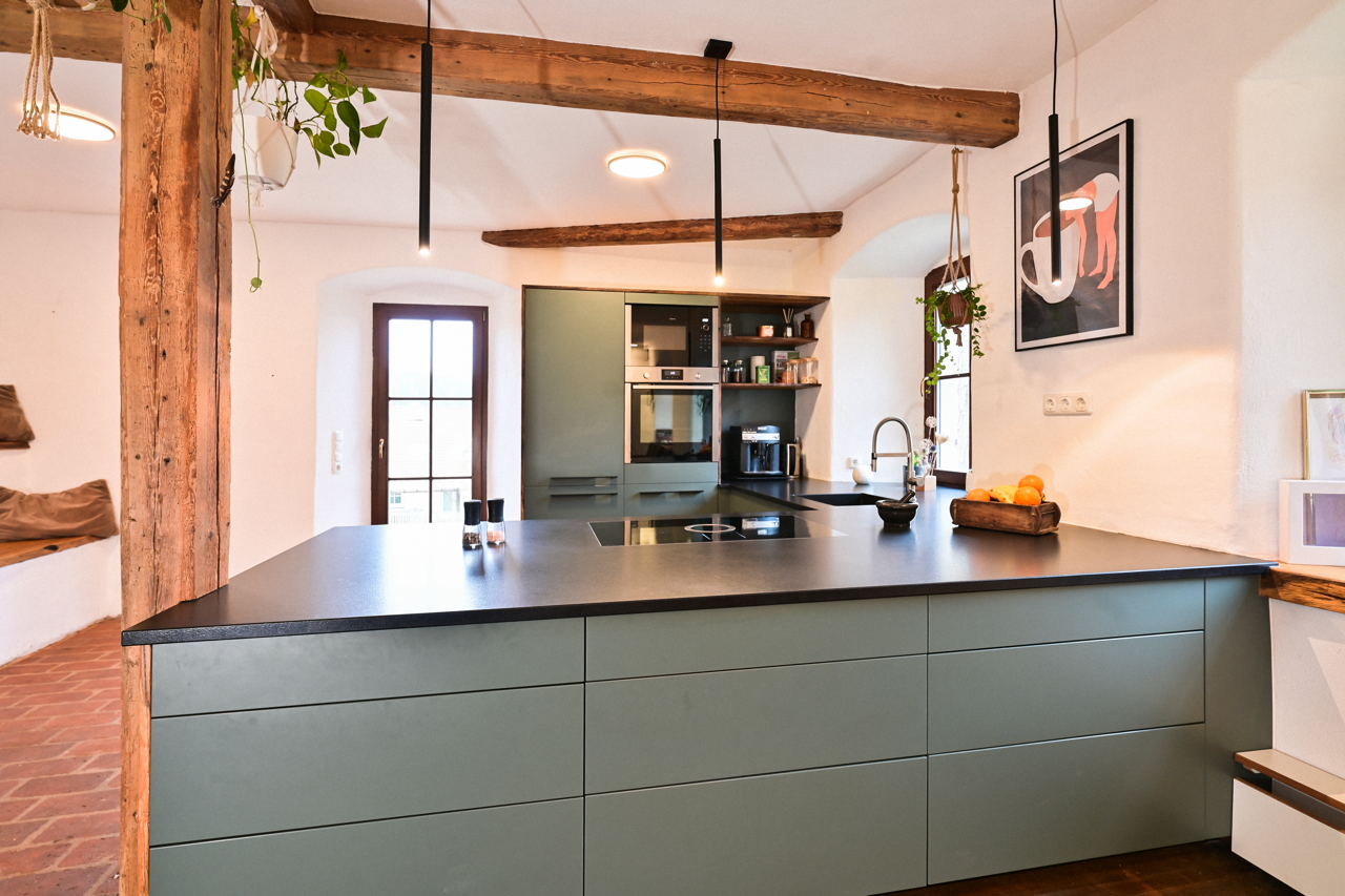 In einem alten Bauernhaus von 1842, dessen Balken mehr Geschichten tragen als mancher Bildband, ist eine Küche entstanden, die nicht laut sein will – sondern wahr.