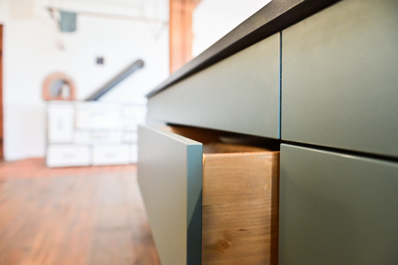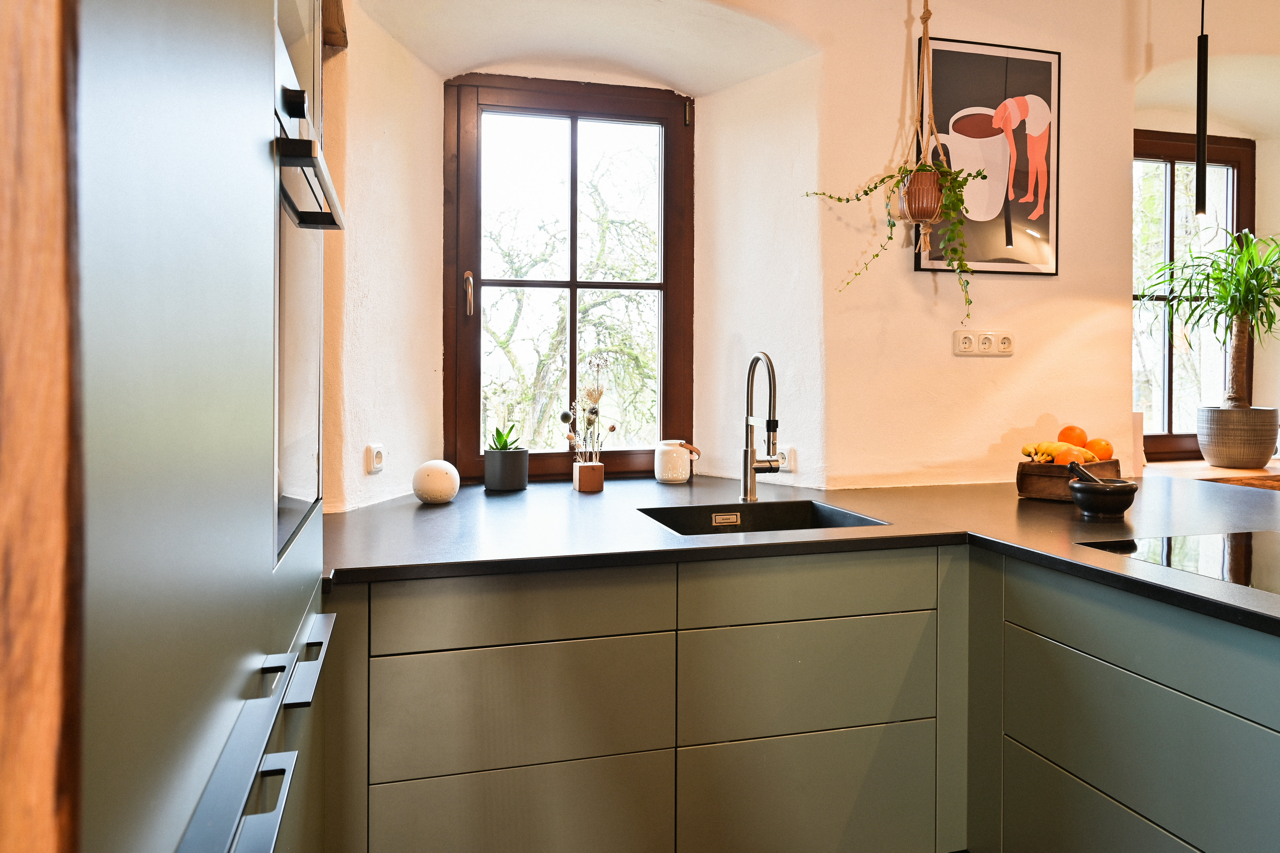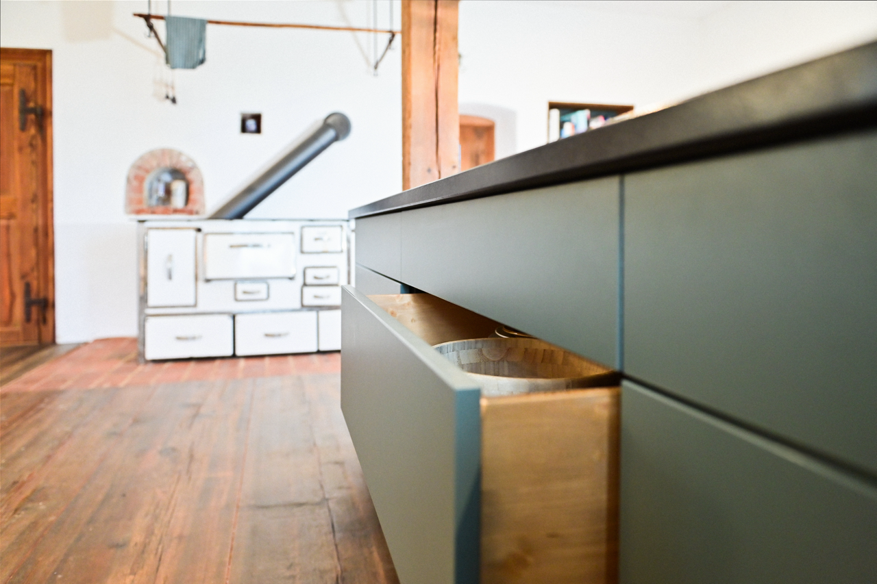 Die Fronten in Dunkelgrün – ein satter, erdverbundener Ton. Wie das Moos am alten Bruchstein, wie die schweren Fensterläden vergangener Jahrzehnte. Kein dekorativer Akzent, sondern eine Farbe mit Herkunft. Sie verbindet innen und außen, Raum und Landschaft, Gestern und Heute.