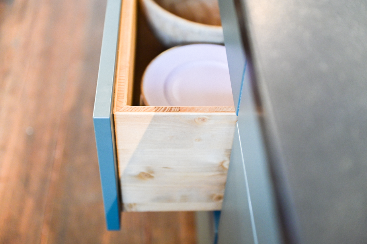 Der Korpus und die Laden aus Fichte-3-Schichtplatte, schwarz matt lackiert. Kein Hochglanz, kein Effekt. Eine Oberfläche, die das Licht schluckt statt es zu spiegeln. Reduktion als Haltung. Handwerklich gefertigt, mit dem Wissen, dass Möbel nicht für einen Katalog entstehen, sondern für Menschen.